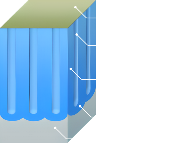 その点、クニマイト皮膜は高熱に加熱してもクラックが入らないので、電気絶縁性が保持されます。従来は、エッチングチャンバーが高熱化することにより、電気絶縁性が低下して不安定なプラズマ状態となり、エッチングに支障をきたしていました。