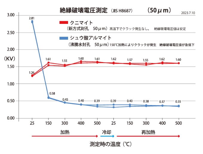クニマイトの特長は、高温環境下でもアルマイト皮膜にクラックが発生しないことです。400℃に加熱しても皮膜にクラックは発生しません。